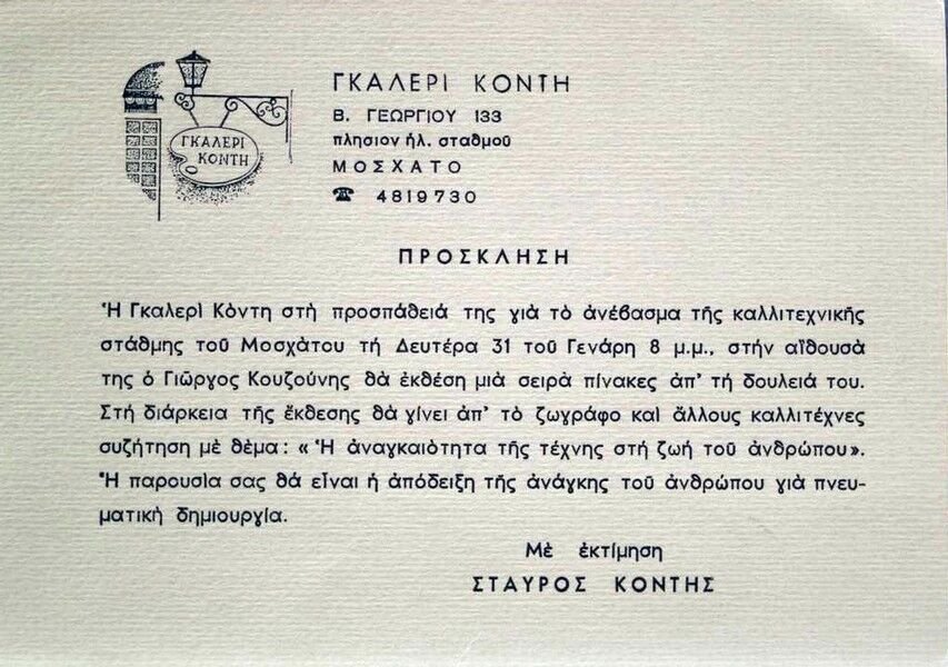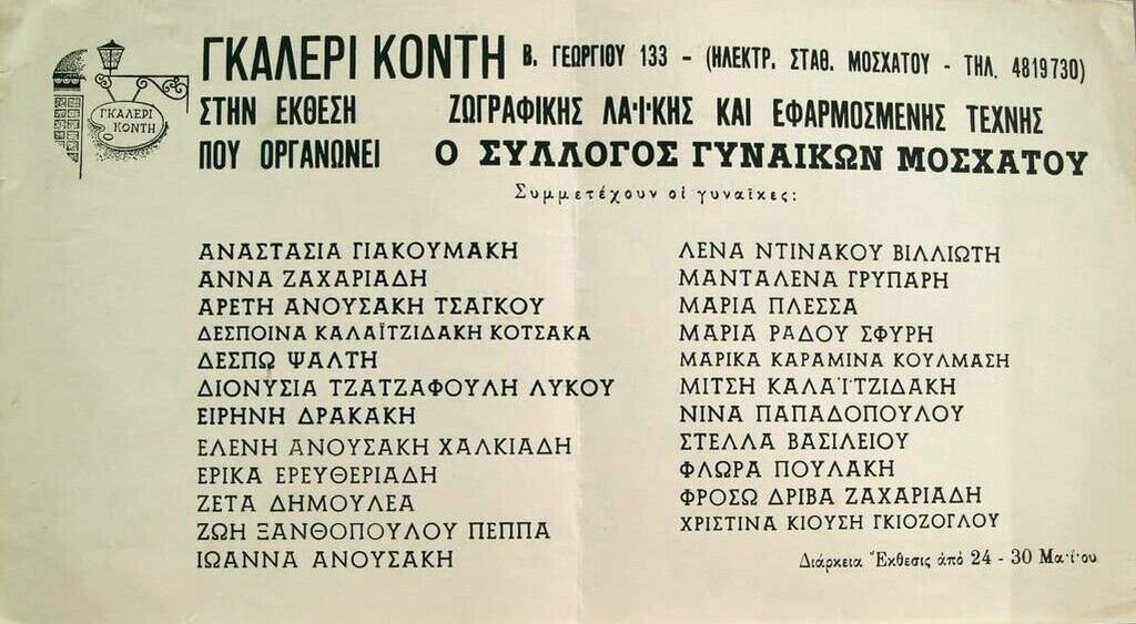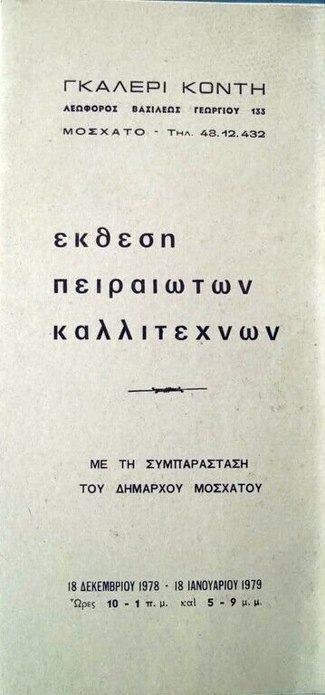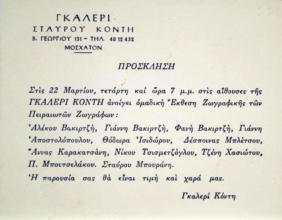 Η οικογένεια Κόντη δραστηριοποιείται στο χώρο των εικαστικών τεχνών από το 1968 στην οδό Μακρυγιάννη 131 στο Μοσχάτο με αρχική δραστηριότητα ΕΡΓΑ ΤΕΧΝΗΣ ΚΟΡΝΙΖΕΣ. Το 1976 μεταφέρει τα "Εργα Τέχνης" στην οδό Μακρυγιάννη 133 όπου και γίνεται αποκλειστικά, Η αίθουσα τέχνης "ΓΚΑΛΕΡΙ ΚΟΝΤΗ". Έχει στο ενεργητικό της όχι μόνο ατομικές και ομαδικές εκθέσεις επιφανών εικαστικών καλλιτεχνών. Ζωγράφων, Γλυπτών, Χαρακτών, Αγιογράφων. Ελλήνων και ξένων, αλλά και μια άγνωστη για πολλούς δράση, Γιατί από το 1977 λειτούργησε και σαν Πνευματικό Κέντρο όπου παρουσιάζει, και προβάλει το έργο σπουδαίων λογοτεχνών, ηθοποιών, και δημοσιογράφων. Ανάμεσα τους ,κατά καιρούς τιμήθηκαν ως εργάτες του γραπτού λόγου οι ακόλουθοι : Απόστολος Μαγκανάρης, ποιητής δημοσιογράφος διευθυντής της εφημερίδας Τα Νέα ιδρυτής των περιοδικών Μάσκα Θεατής, κτλ. Μάνος Κατράκης ο αξέχαστος κορυφαίος ηθοποιός που η σταδιοδρομία του στο θέατρο και στον κινηματογράφο υπήρξε ανεπανάληπτη , ο σημαντικός και βραβευμένος ποιητής Νικηφόρος Βρεττάκος, Ο Βασίλης Μεσολογγίτης, ο Βασίλης Μοσκόβης, Ο Σόλων Κυδωνιάτης, ο Νίκος Μαραγκός και άλλοι. Από τους εικαστικούς καλλιτέχνες τιμήθηκαν οι : Θ. Λεκός , Κ . Βαλσάµης , Γ. Κουζούνης , Μ. Νικολινάκος , Μ. Σοφιανός , Δ .Τηνιακός , Μαξ ΄Ελστερν , Μ.Κανδύλης, Α. Κανάς, Γ. Βακιρτζής , Ν .Κόντης , Σ. Ράλλη , K. Νιάρχος και άλλοι. Όταν δημιουργήθηκε ο θεσμός της πολιτιστικής πρωτεύουσας της Ευρώπης με πρώτη την Αθήνα η γκαλερί για να τιμήσει τον Πειραιά εξέδωσε δυο βιβλία "Σύγχρονοι πειραιώτες ζωγράφοι" και "Η καλλιτεχνική ιστορία του Πειραιά" του λογοτέχνη κριτικού τέχνης Κώστα Θεοφάνους.