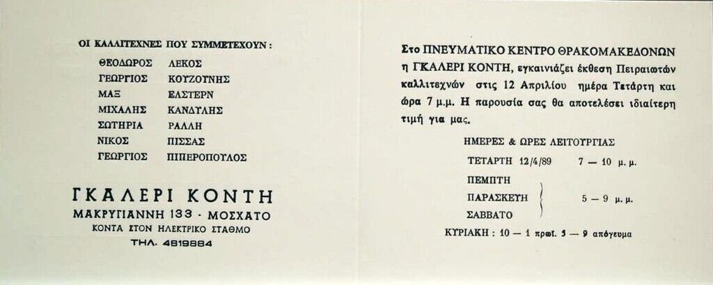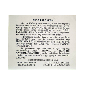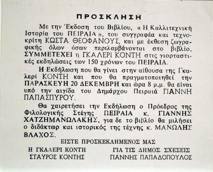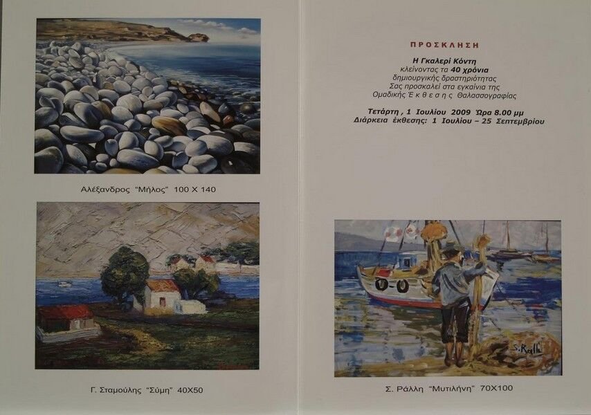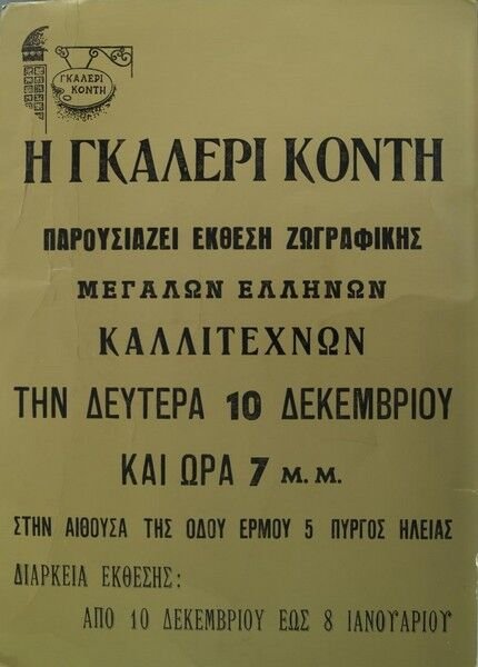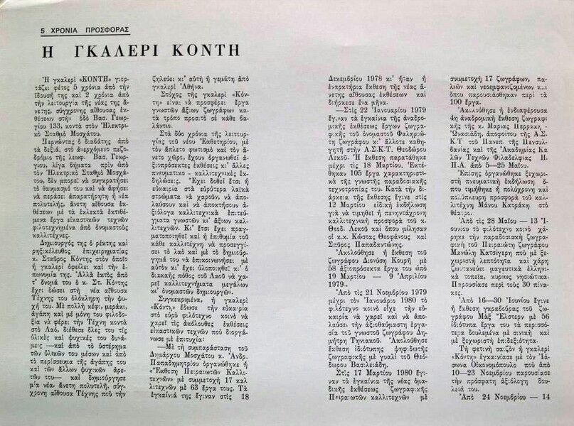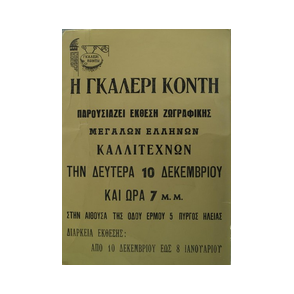 Η οικογένεια Κόντη δραστηριοποιείται στο χώρο των εικαστικών τεχνών από το 1968 στην οδό Μακρυγιάννη 131 στο Μοσχάτο με αρχική δραστηριότητα ΕΡΓΑ ΤΕΧΝΗΣ ΚΟΡΝΙΖΕΣ. Το 1976 μεταφέρει τα "Εργα Τέχνης" στην οδό Μακρυγιάννη 133 όπου και γίνεται αποκλειστικά, Η αίθουσα τέχνης "ΓΚΑΛΕΡΙ ΚΟΝΤΗ". Έχει στο ενεργητικό της όχι μόνο ατομικές και ομαδικές εκθέσεις επιφανών εικαστικών καλλιτεχνών. Ζωγράφων, Γλυπτών, Χαρακτών, Αγιογράφων. Ελλήνων και ξένων, αλλά και μια άγνωστη για πολλούς δράση, Γιατί από το 1977 λειτούργησε και σαν Πνευματικό Κέντρο όπου παρουσιάζει, και προβάλει το έργο σπουδαίων λογοτεχνών, ηθοποιών, και δημοσιογράφων. Ανάμεσα τους ,κατά καιρούς τιμήθηκαν ως εργάτες του γραπτού λόγου οι ακόλουθοι : Απόστολος Μαγκανάρης, ποιητής δημοσιογράφος διευθυντής της εφημερίδας Τα Νέα ιδρυτής των περιοδικών Μάσκα Θεατής, κτλ. Μάνος Κατράκης ο αξέχαστος κορυφαίος ηθοποιός που η σταδιοδρομία του στο θέατρο και στον κινηματογράφο υπήρξε ανεπανάληπτη , ο σημαντικός και βραβευμένος ποιητής Νικηφόρος Βρεττάκος, Ο Βασίλης Μεσολογγίτης, ο Βασίλης Μοσκόβης, Ο Σόλων Κυδωνιάτης, ο Νίκος Μαραγκός και άλλοι. Από τους εικαστικούς καλλιτέχνες τιμήθηκαν οι : Θ. Λεκός , Κ . Βαλσάµης , Γ. Κουζούνης , Μ. Νικολινάκος , Μ. Σοφιανός , Δ .Τηνιακός , Μαξ ΄Ελστερν , Μ.Κανδύλης, Α. Κανάς, Γ. Βακιρτζής , Ν .Κόντης , Σ. Ράλλη , K. Νιάρχος και άλλοι. Όταν δημιουργήθηκε ο θεσμός της πολιτιστικής πρωτεύουσας της Ευρώπης με πρώτη την Αθήνα η γκαλερί για να τιμήσει τον Πειραιά εξέδωσε δυο βιβλία "Σύγχρονοι πειραιώτες ζωγράφοι" και "Η καλλιτεχνική ιστορία του Πειραιά" του λογοτέχνη κριτικού τέχνης Κώστα Θεοφάνους.